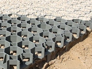 Series of interlocking plastic or synthetic grid filled with gravel or soil and can be planted with vegetation such as grass.